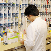 薬剤師04 入院患者様と外来患者様のためのお薬の準備や在庫管理など、薬局運営にかかわる業務を主に行っていただきます。能力に応じてチーム医療の一員としてNSTや在宅復帰支援の現場で活躍することもできます。薬局は少人数で運営しているため、個人の能力が目立つ部署でもあります。自分のスキルアップがそのまま薬局の実績にも反映されるため、やりがいを感じられる部署です。